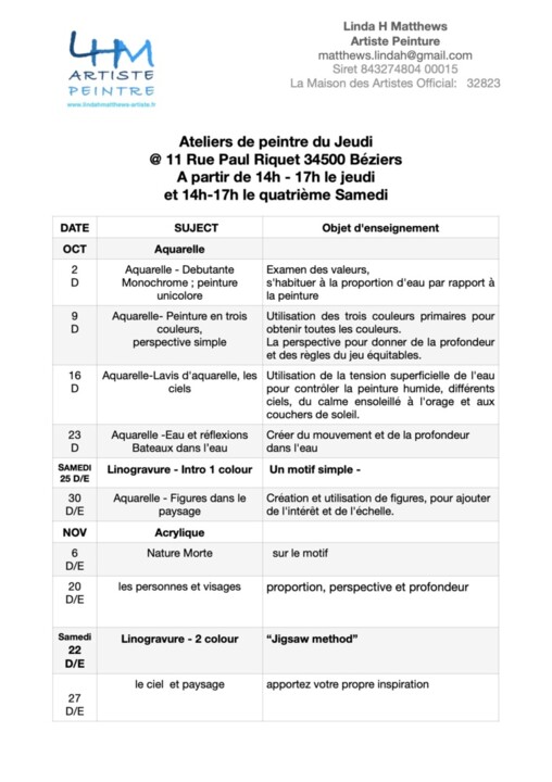 As part of my membership of the Association Expression Créative d’Oc a shared studio space at 11 Rue Paul Riquet in Béziers I am able to offer weekly workshops in different media. Watercolour, Oil, Acrylique, Drawing and on Saturdays Linoprints All materials are supplied to use on the day. One to one tuition also availableClasses at 11 Rue Paul Riquet 34500 Béziers